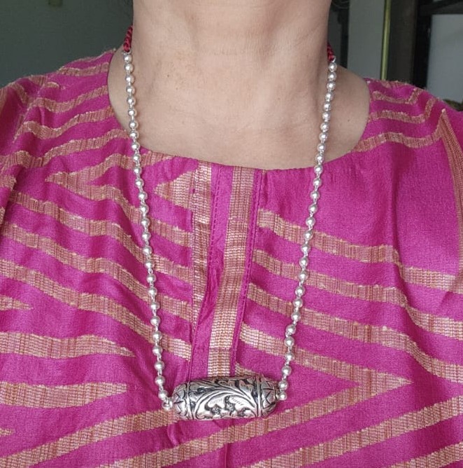 This beautiful Chitai Dholki Pendant is a rare piece. The dori can be extended as per your choice. It goes well with a saree, suits and Western wear.