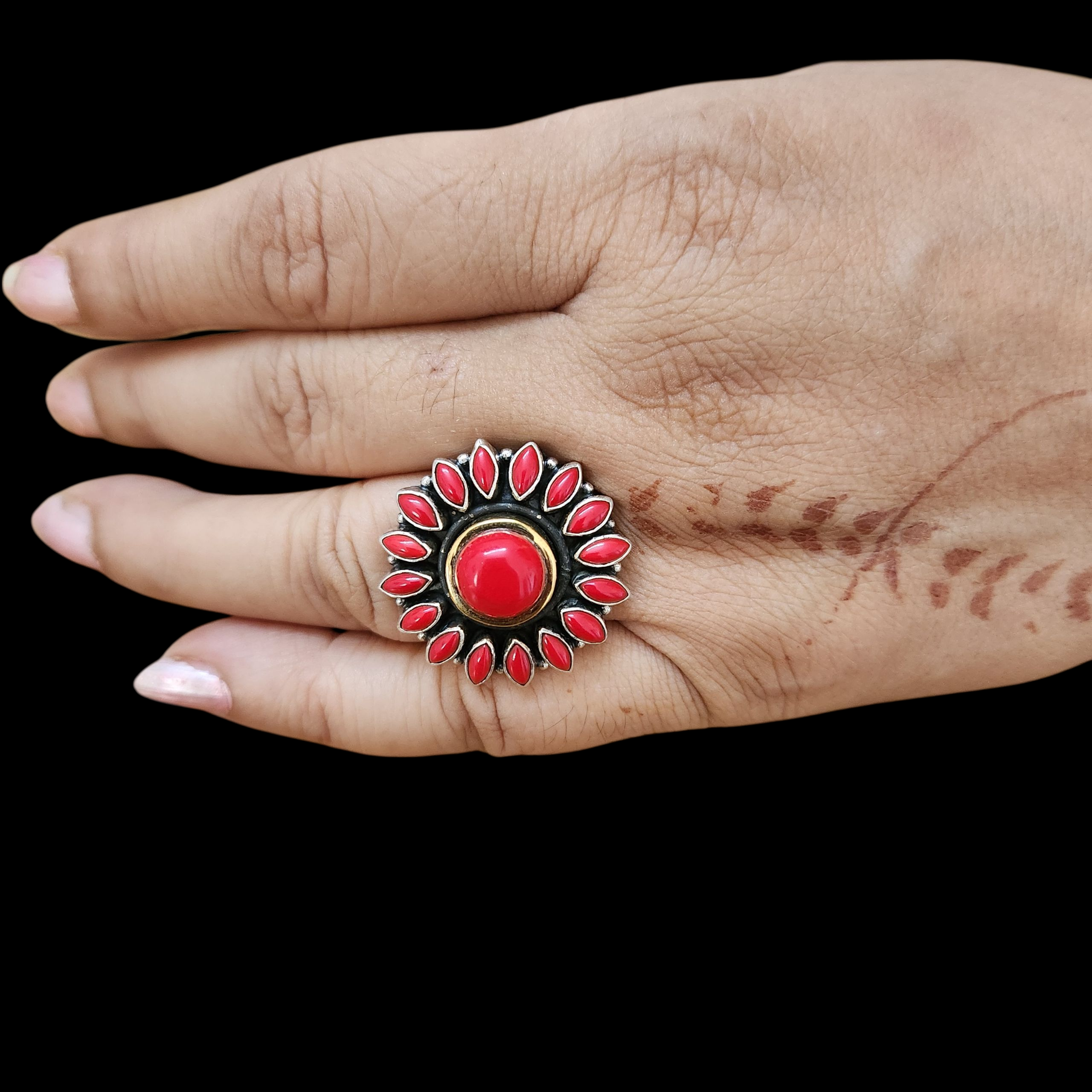This beautiful piece gives a royal look and sits well on any finger. It is adjustable and is more of a statement ring and can be paired with any silver accessory.